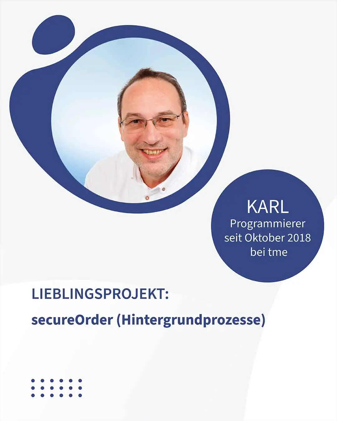 Heute stellen wir Ihnen Karl vor: Seit Oktober 2018 unterstützt er unser Entwicklerteam mit Fachwissen, Weitblick und einem ruhigen Kopf, selbst bei komplexen Systemen. Sein Lieblingsprojekt? secureOrder – die Softwarelösung für elektronische Auftragserfassung im Laborumfeld. „Hintergrundprozesse sind genau mein Ding", sagt Karl. „Sie laufen unsichtbar – müssen aber perfekt funktionieren, damit alles andere rund läuft." Und genau darin liegt Karls Stärke: In der sauberen, durchdachten Architektur von Software, die im Alltag zuverlässig funktioniert.